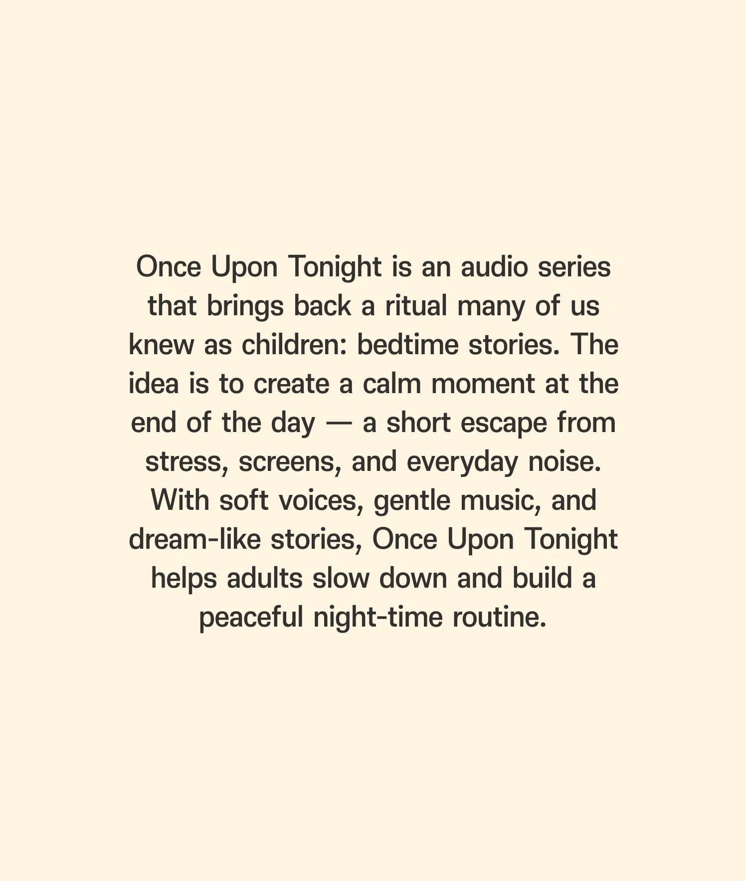 With soft voices, gentle music, and dream-like stories, Once Upon Tonight helps adults slow down and build a peaceful night-time routine.